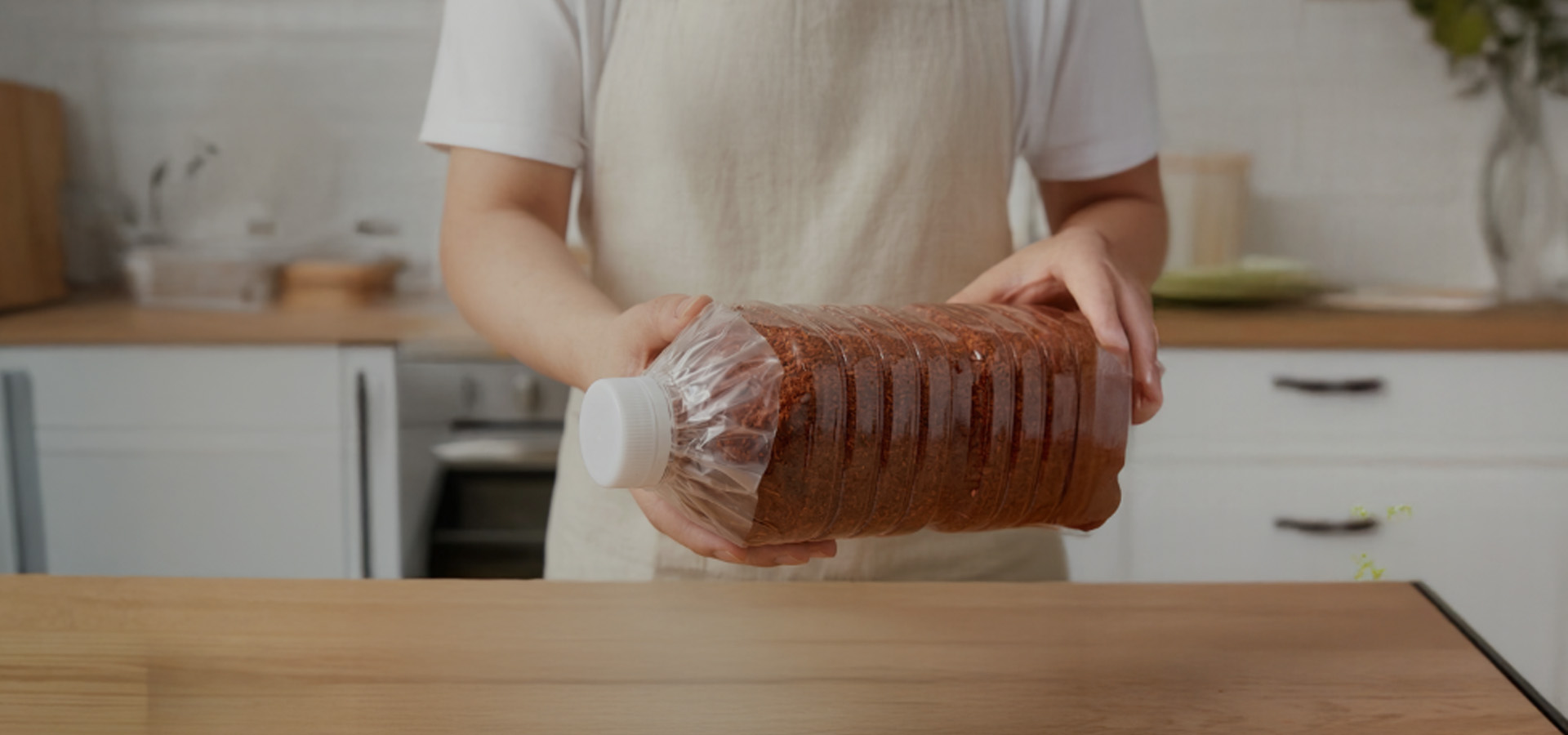 페트병에 담았다고 해서 공기가 완전히 차단되는 것은 아닙니다. 뚜껑만 닫으면 미세한 틈으로 공기가 들어갈 수 있기 때문에, 입구를 비닐로 한 번 더 감싼 뒤 뚜껑을 닫아 이중 밀봉해 주세요. 이렇게 하면 공기를 훨씬 더 효과적으로 막을 수 있어 고춧가루를 더 오래 신선하게 보관할 수 있습니다.
