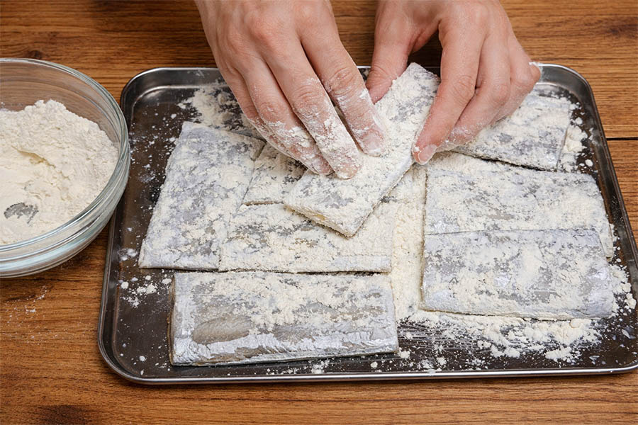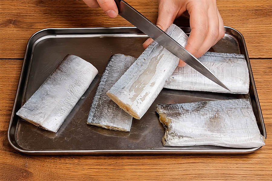 비늘을 제거한 갈치에 밀가루 1스푼을 넣고 주무르듯 씻어주면 남아있는 은색 비늘이 제거되고, 잡내가 사라집니다.