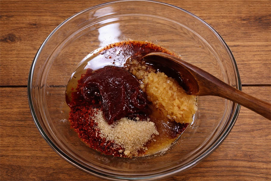 고춧가루 3스푼, 진간장 4스푼, 멸치액젓 2스푼, 설탕 2스푼, 다진 마늘 1스푼, 맛술 2스푼, 생강가루 ½ 스푼을 넣고 섞어주세요.