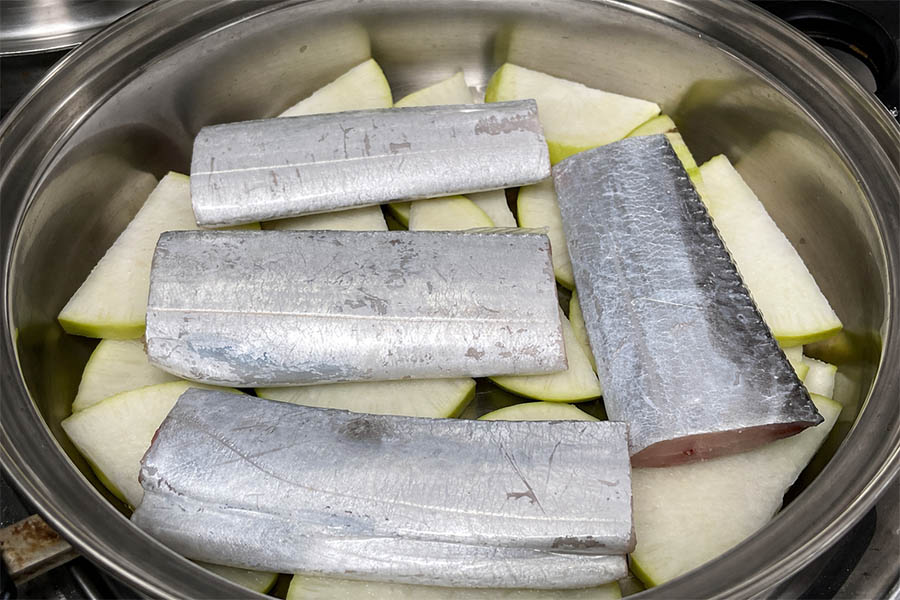 ③ 냄비에 채소, 갈치, 양념장 넣기