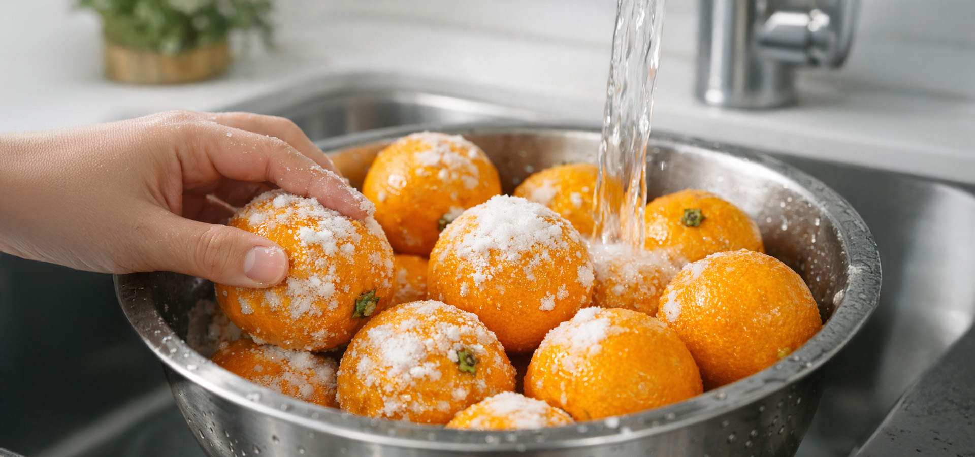 베이킹소다를 껍질을 벗기지 않은 귤에 골고루 묻혀 손으로 문질러 가며 닦아 주세요. 농약 성분을 제거할 수 있습니다. 다 닦은 귤은 미지근한 물에 30분 간 담가 놓으세요.