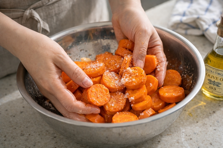 비닐팩 또는 볼에 당근을 넣고 올리브유와 소금을 넣어 섞어주세요. 골고루 코팅되도록 충분히 버무립니다.