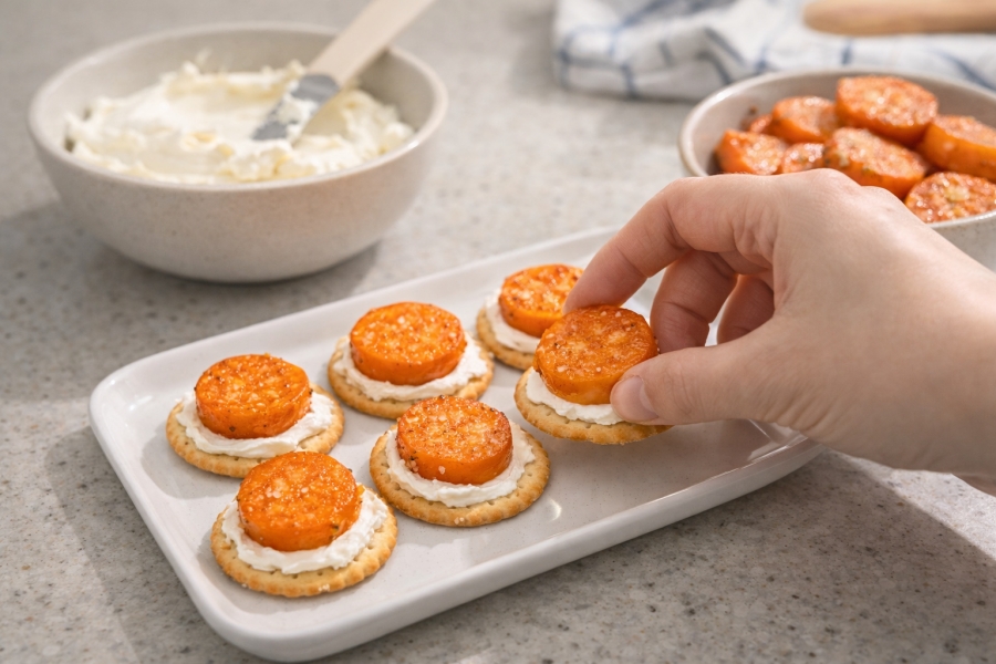 크래커 위에 크림치즈를 바르고 구운 당근을 올려주세요. 카나페로 즐길 수 있습니다.