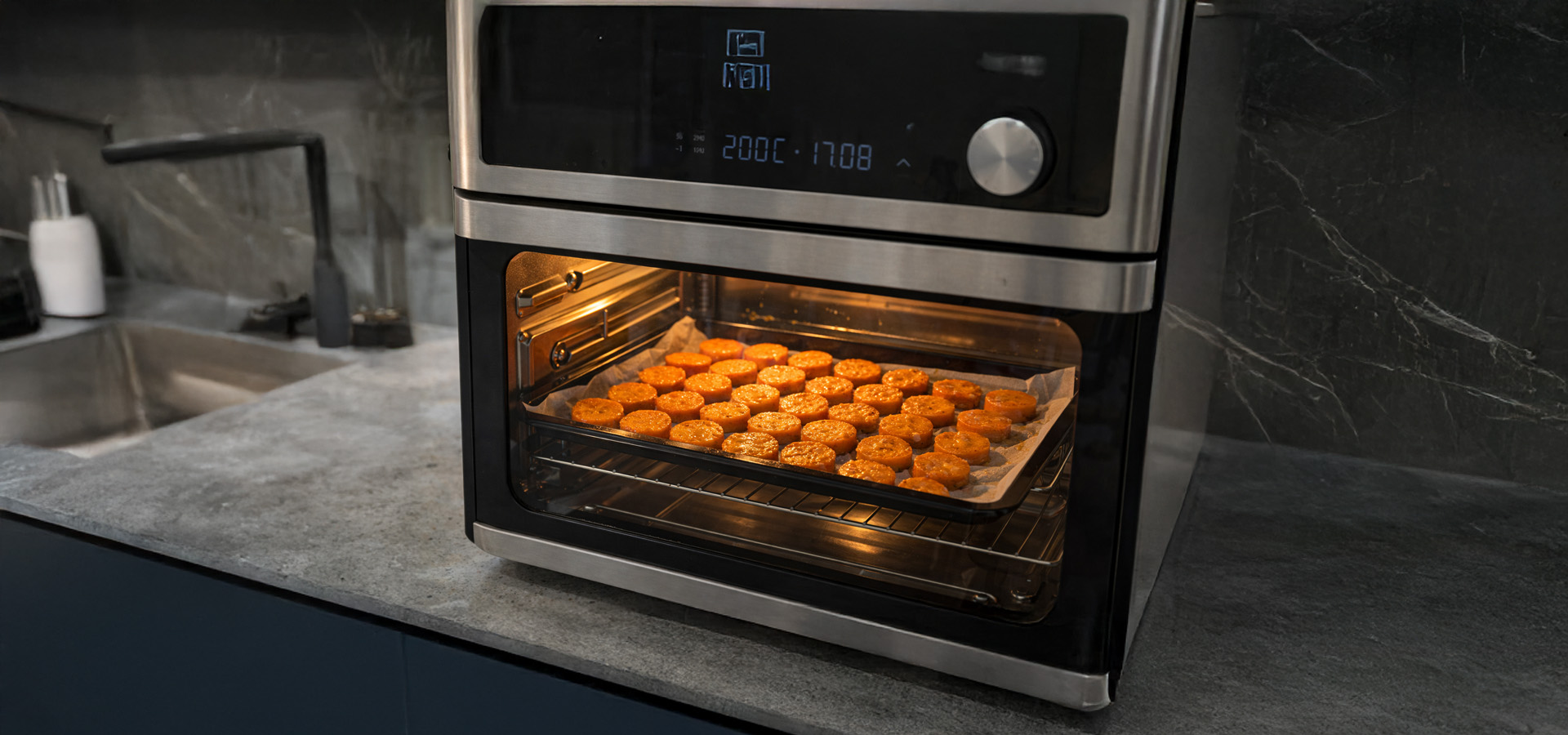 트레이에 당근을 겹치지 않게 펼쳐줍니다. 200도로 예열 후 20~25분 구워주세요.